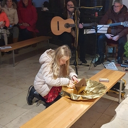 In seiner Predigt sprach Vikar Gerhard von Gott, der als kleines, hilfloses Kind zur Welt gekommen ist, in Armut und Bedürftigkeit. Eine mitgebrachte Windel symbolisiert dies. - Gott ist einer von uns, er kommt uns entgegen. Er ist ein Gott, an den wir uns anlehnen können. Er umarmt uns und stillt unser Verlangen nach Geborgenheit, Liebe und Frieden. …